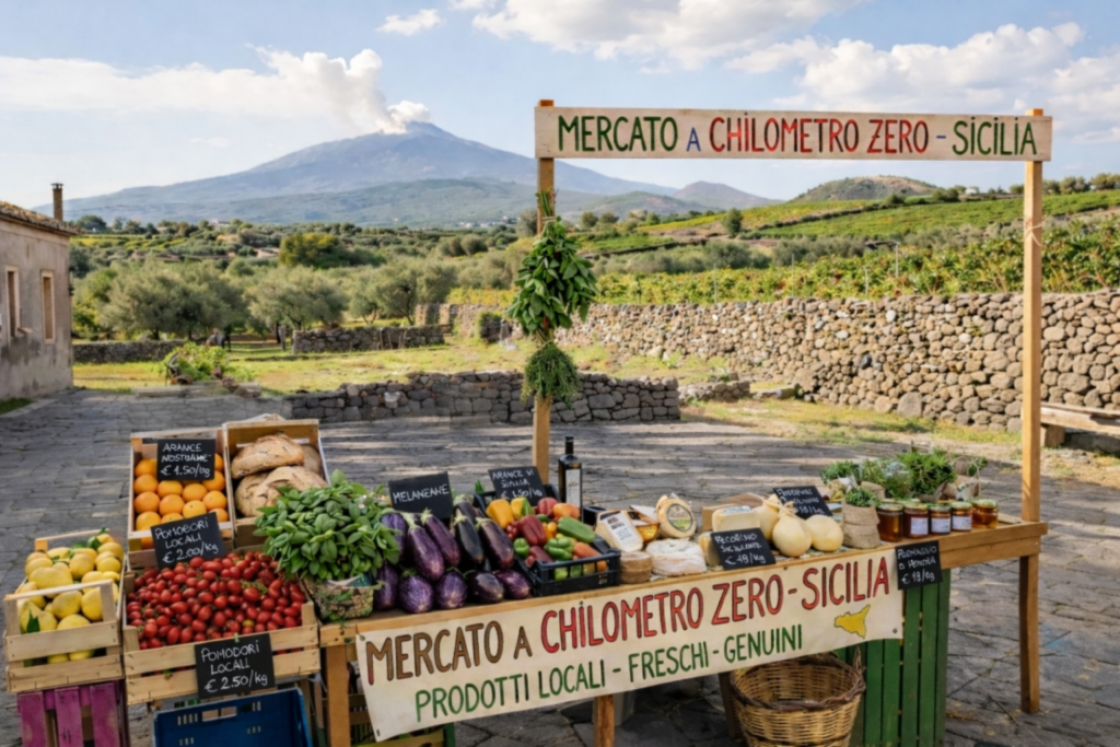 Na Sycylii jedzenie nie zaczyna się w sklepie. Zaczyna się na polu, w sadzie, w małej rodzinnej tłoczni albo w ogrodzie za domem. Dlatego właśnie na wyspie tak ważna jest filozofia „chilometro zero” – km zero, czyli żywności produkowanej lokalnie, bardzo blisko miejsca, w którym jest spożywana. To nie tylko trend kulinarny. To sposób życia, który na Sycylii istnieje od pokoleń.